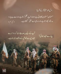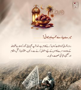 پوسٹرز مسلمان مسلمان کا بھائی ہے، وہ نہ اس پر ظلم کرتا ہے، نہ اسے بے یار و مددگار چھوڑتا ہے، اور نہ ہی اسے حقیر سمجھتا ہے۔ فرمانِ نبوی (صلی اللہ علیہ و سلم) کے مطابق قیدی کو چھڑانا لازم ہے۔ ۲۳ سال ہو گئے… ڈاکٹر عافیہ صدیقی قوم کی بیٹی اب بھی کفار کی قید میں ہے! ۲۳ مارچ کا دن مسلمانانِ ہند کو یہ پیغام دیتا ہے روزہ نفسانی خواہشات کو ضبط کرنے کا نام ہے رمضان ۔۔۔ شھر الصیام والجہاد مومن کی چار حالتیں اے اللہ! ہمیں توفیق دے کہ ہم امت کی بیٹی عافیہ صدیقی کو آزاد کروا سکیں! ہو حلقۂ یاراں تو بریشم کی طرح نرم!