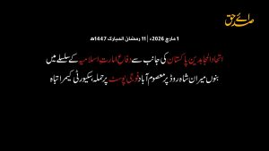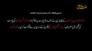ویڈیوز شمالی وزیرستان میں اسلام دشمن فوج کی پوسٹ پر اتحاد المجاہدین پاکستان کے مجاہدین کا حملہ میرعلی میں اسلام دشمن فوج کے قافلے پر اتحاد المجاہدین پاکستان کے مجاہدین کا گھات حملہ جنوبی وزیرستان وانا میں ظالم اور اسلام دشمن فوج کے کیمپ پر مجاہدین کا خود ساختہ جہنم بم سے حملہ اورکزئی ایجنسی کے علاقے علجو میں واقع اسلام دشمن فوج کے قلعے پر اتحاد المجاہدین پاکستان کے مجاہدین کے میزائل (BM) حملے ضلع بنوں میں اتحاد المجاہدین پاکستان کے مجاہدین کی ظالم و اسلام دشمن فوج کے خلاف ڈرون عملیات اتحاد المجاہدین پاکستان کے مجاہدین نے گریڈر مشین گاڑی کو فوج کے درمیان سے غنیمت کرلیا۔ اسلام ترا دیس ہے، تو مصطفوی ہے! دفاعِ امارتِ اسلامیہ 3